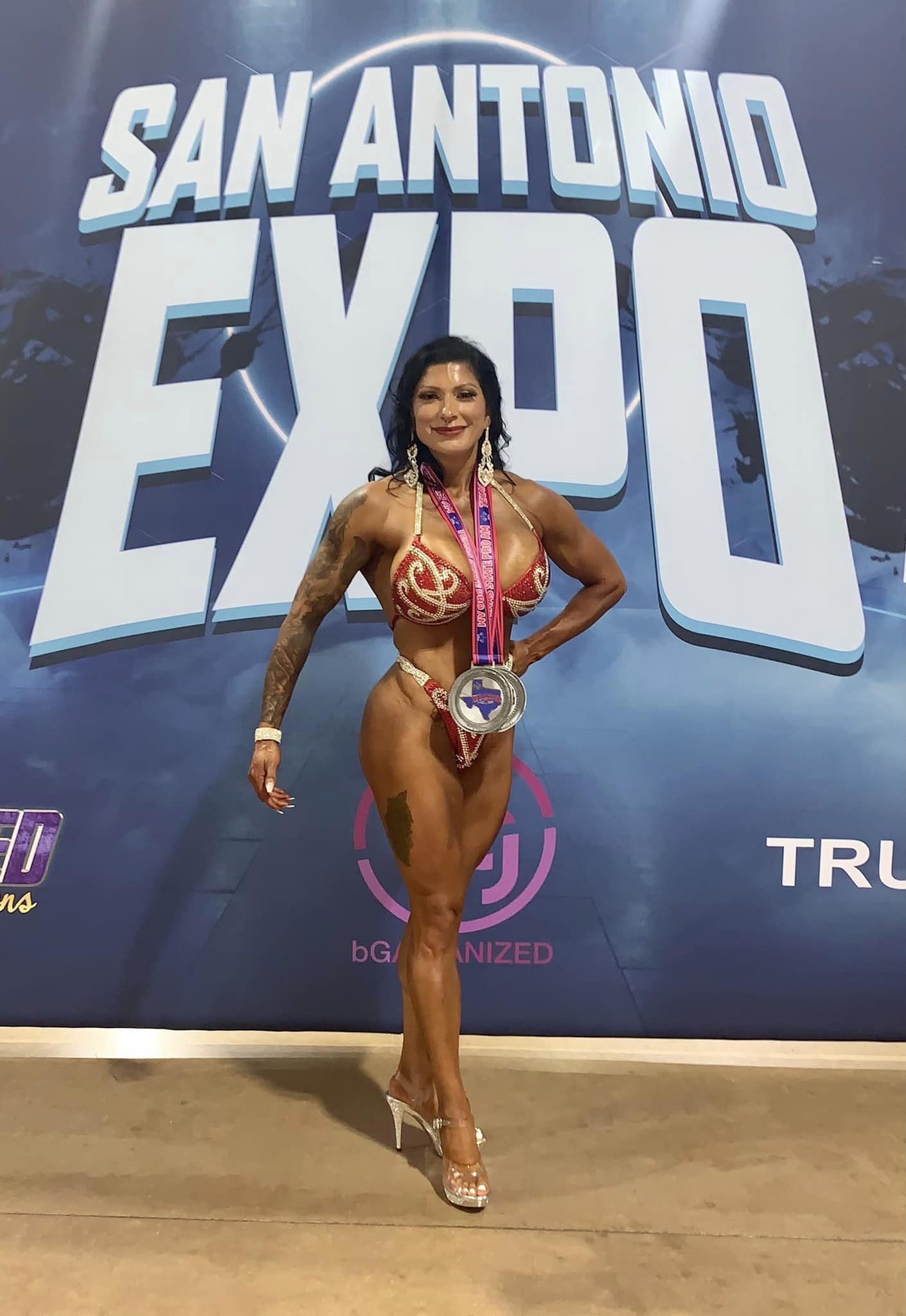 "out I took home the gold, 1st place Masters Bikini at the recent Muscle Mayhem in Duluth, Minnesota. I believe your suit added to my overall stage ambiance. Many thanks and I look forward to doing business with you again! Thank you"